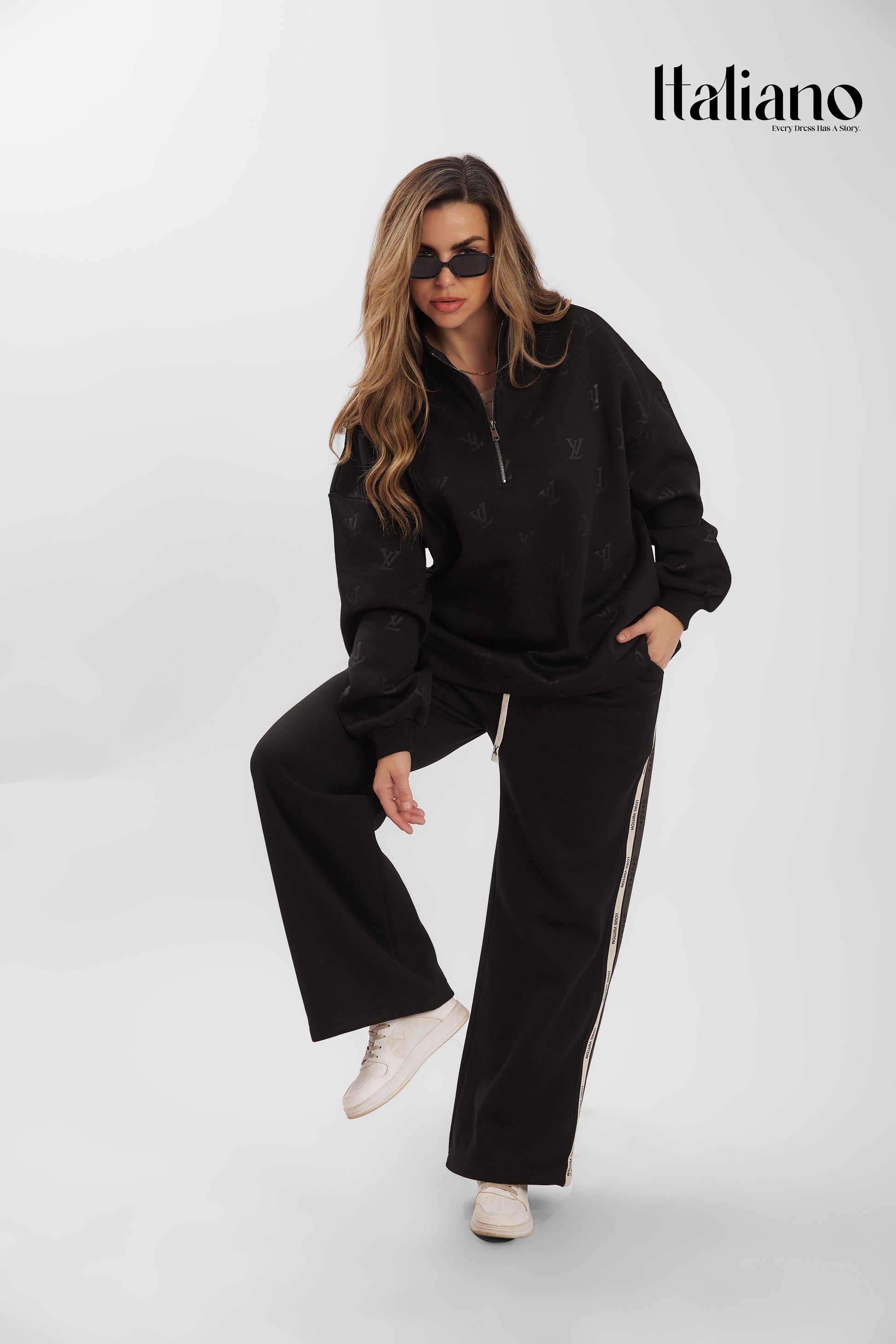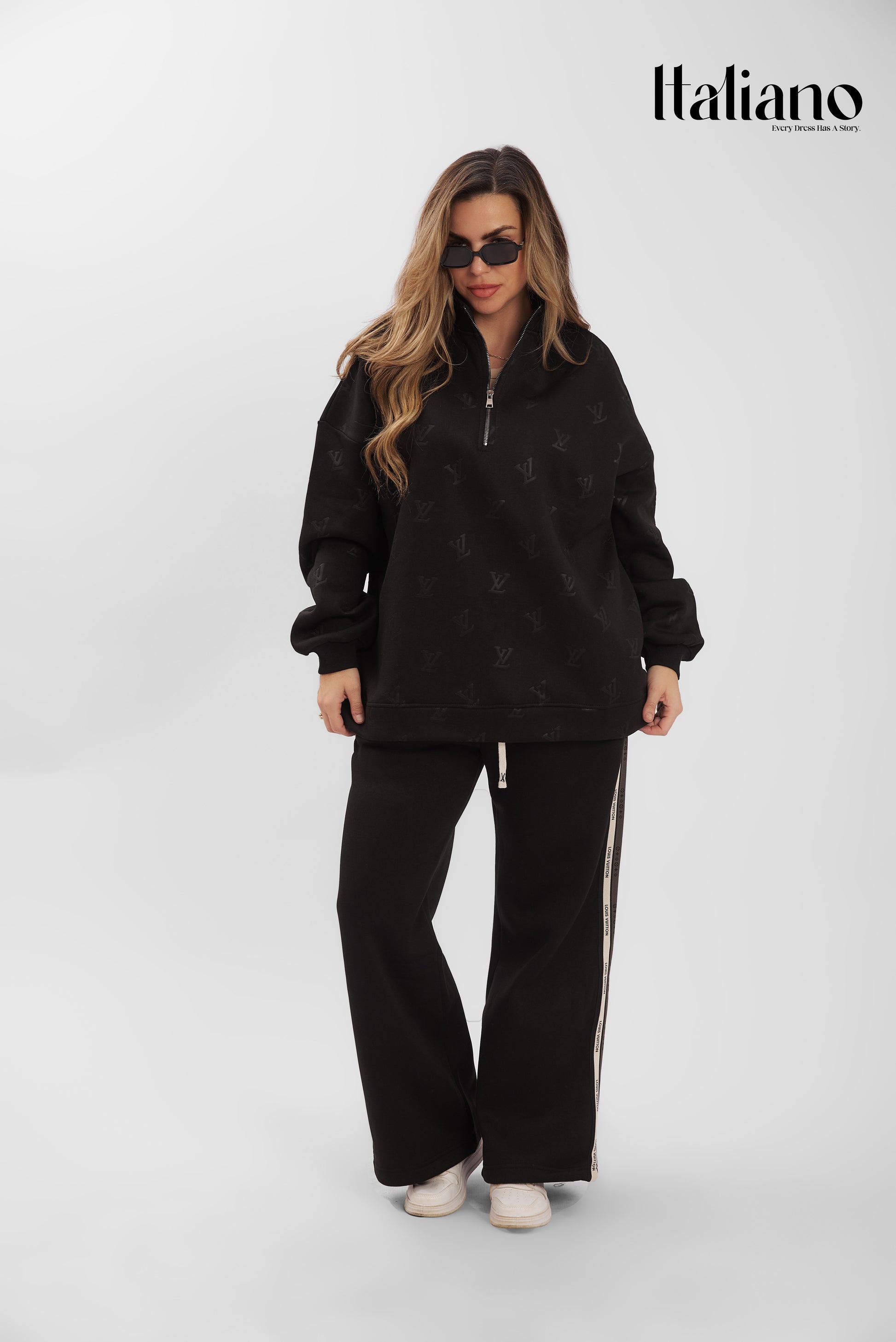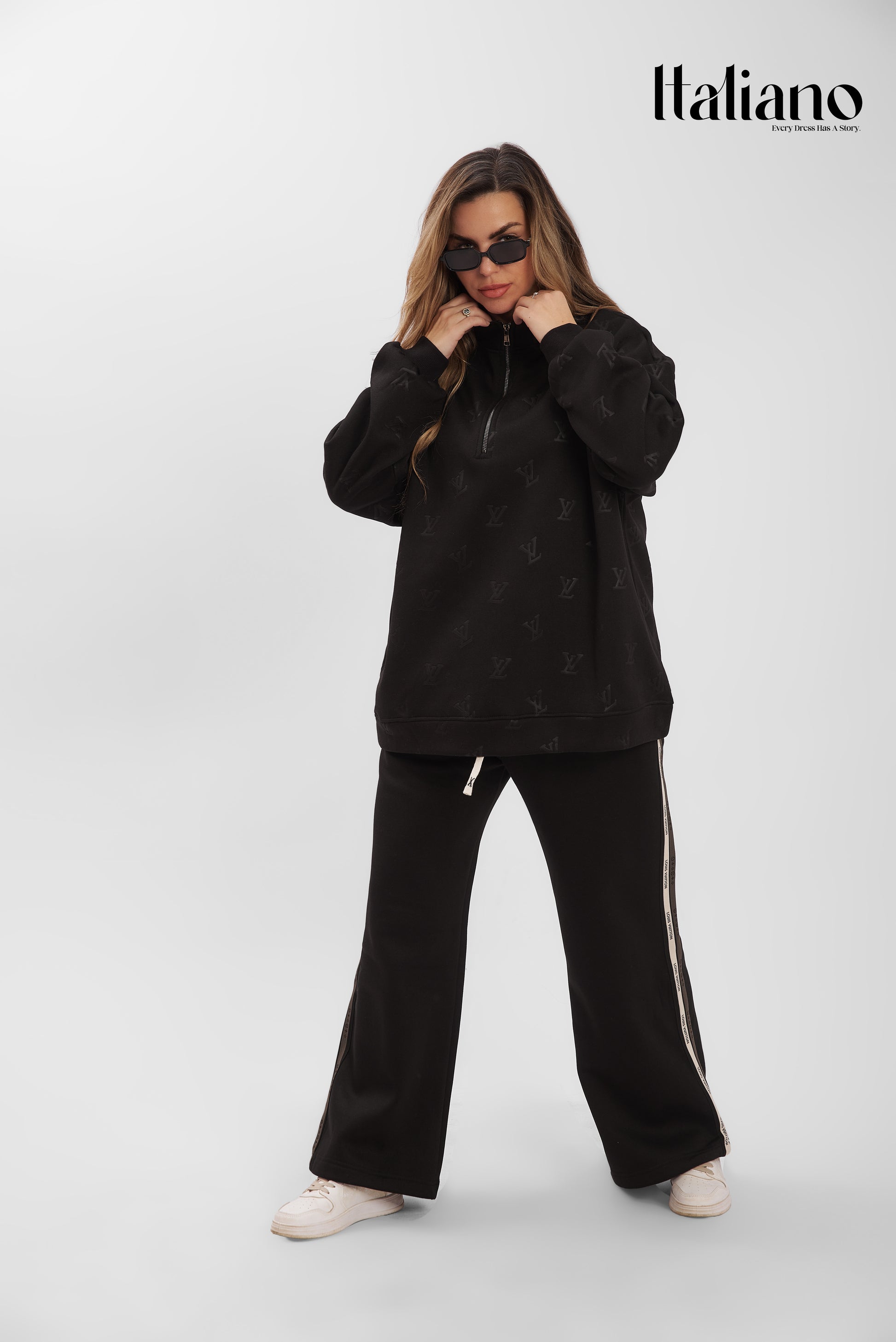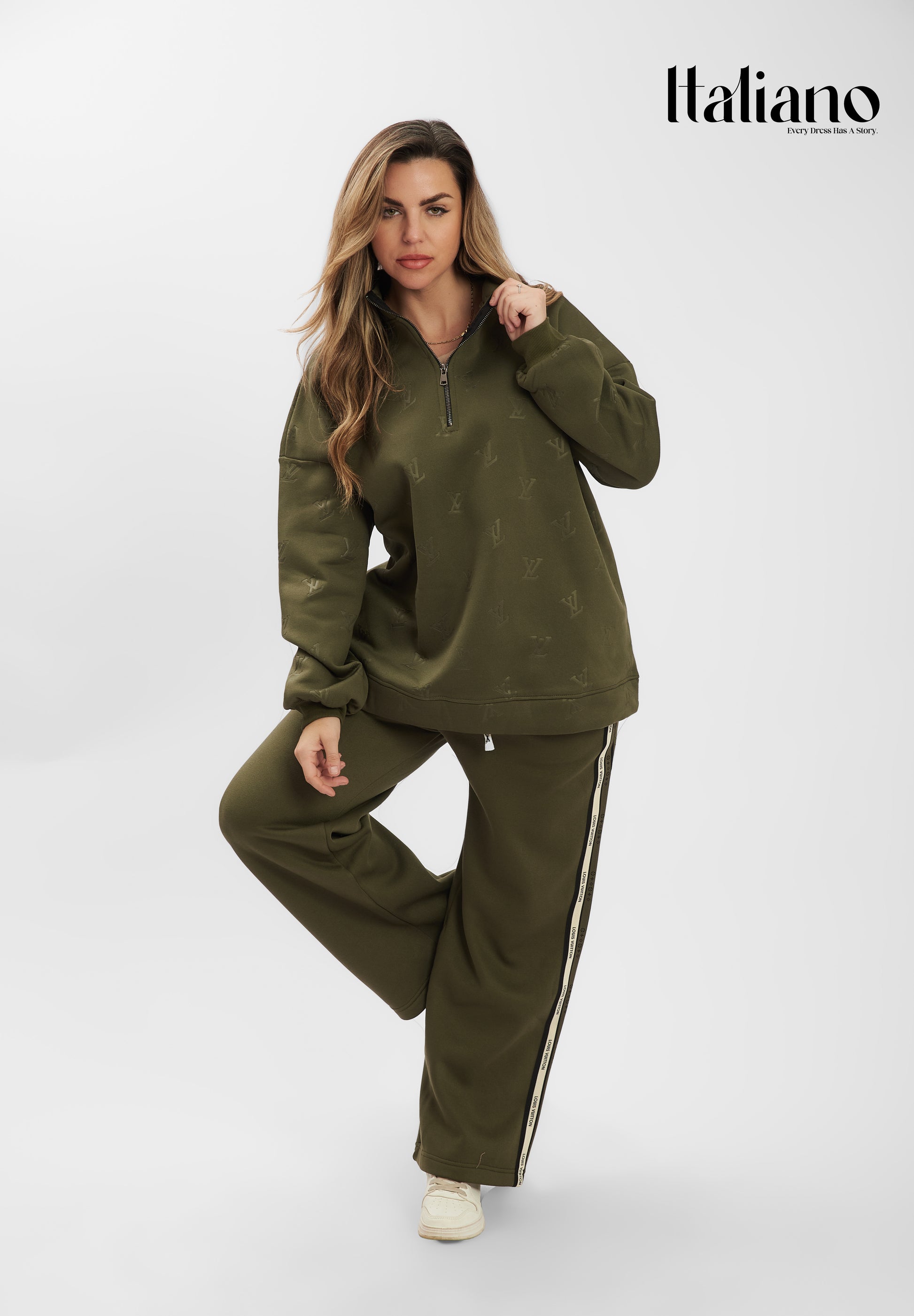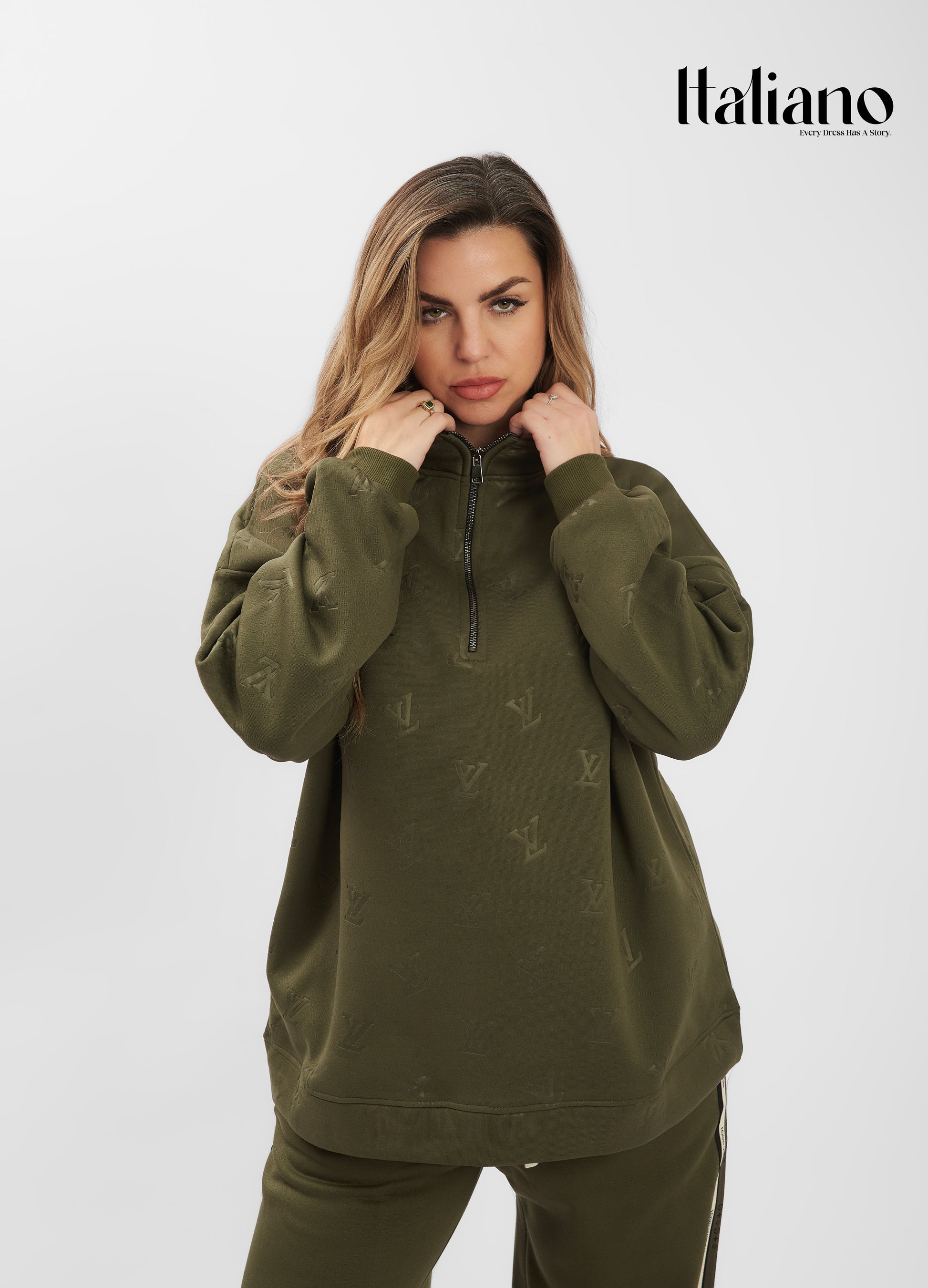 Elevate your casual wardrobe with our LV Quarter Zipper Set, designed for those who value both comfort and high-end style. This two-piece ensemble features a rich olive green hue and a sophisticated embossed monogram pattern throughout the top, offering a subtle nod to luxury.