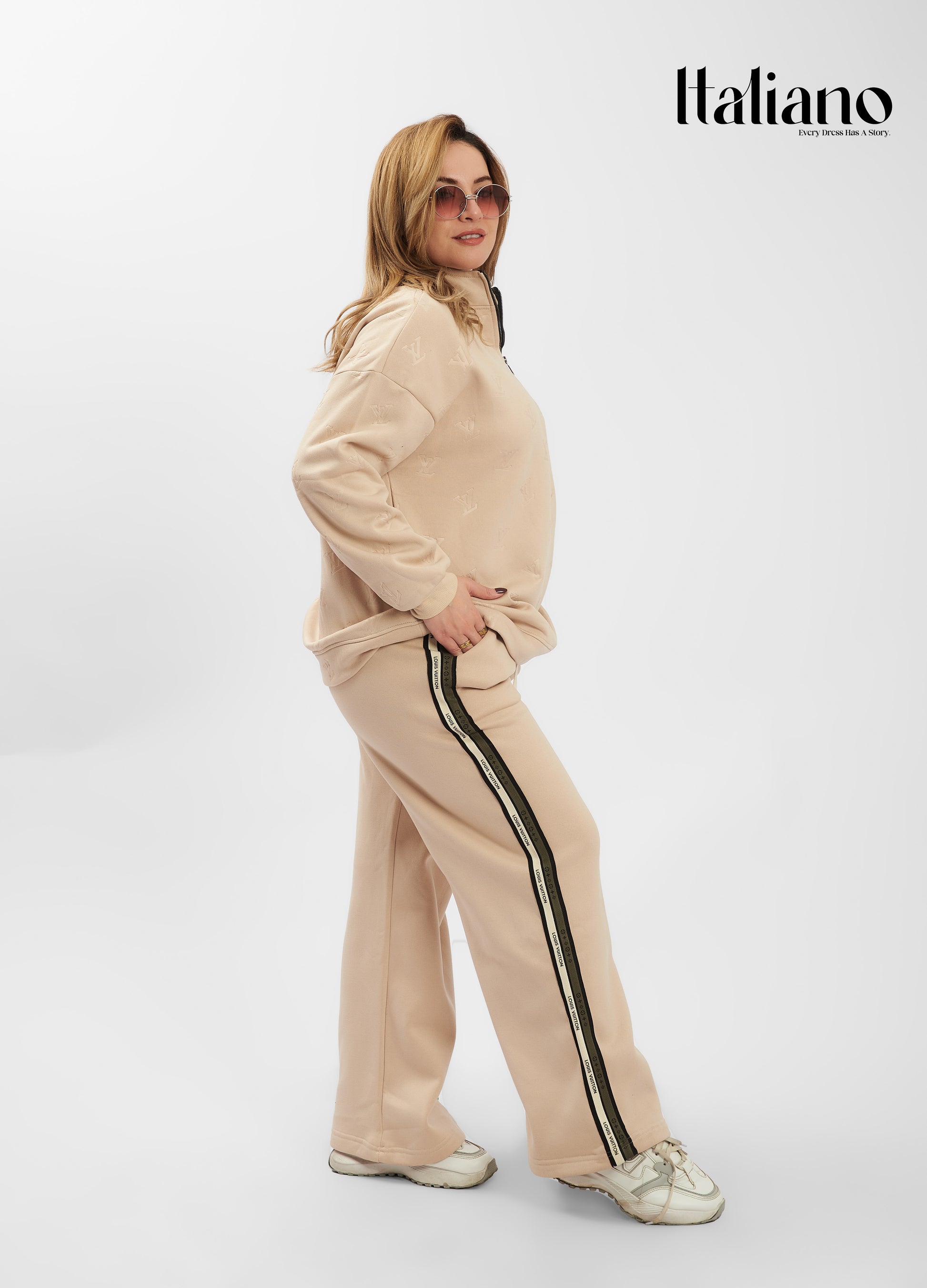 • The Pants: Matching wide-leg trousers featuring a branded side stripe that adds a sporty, elongated effect to the legs.