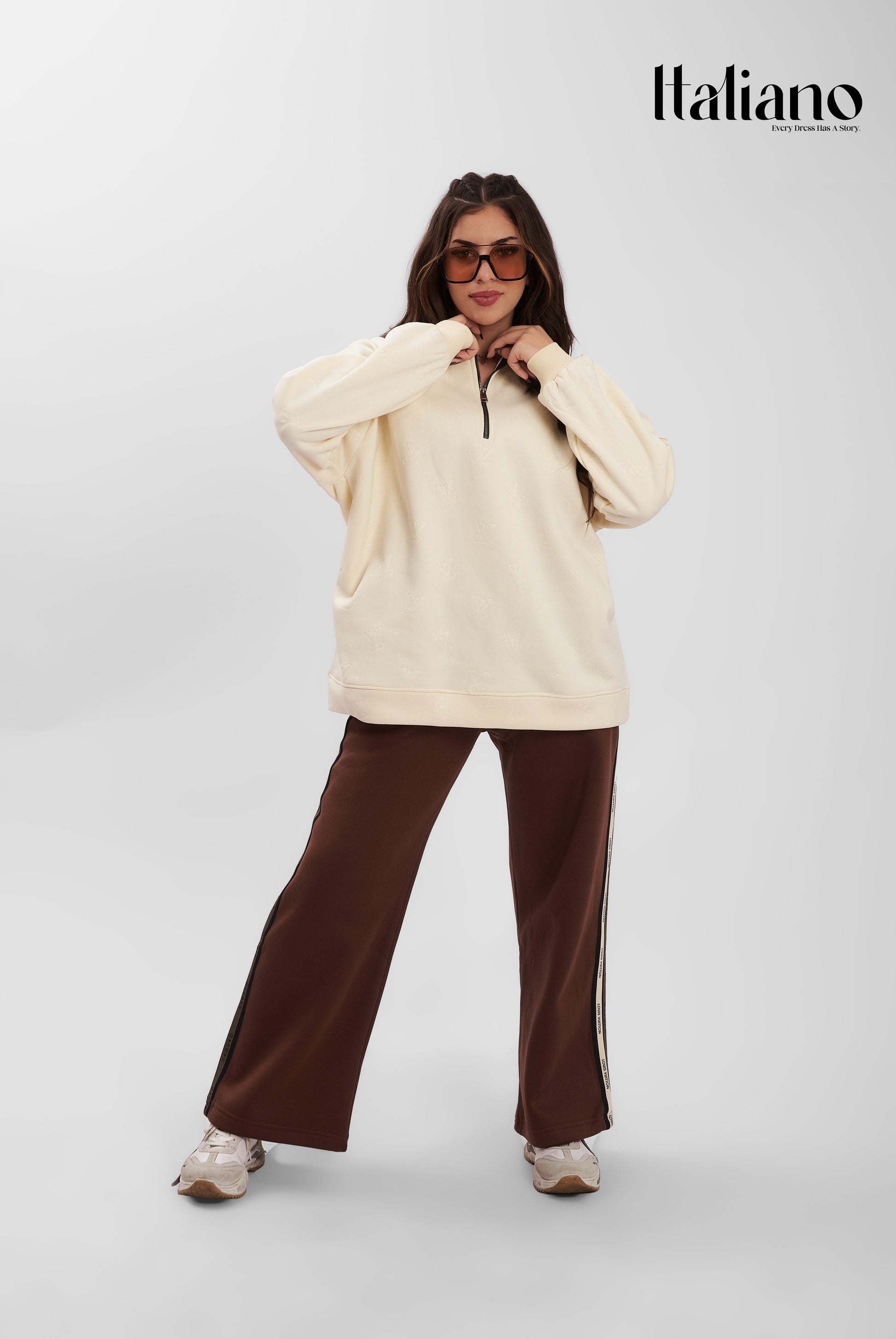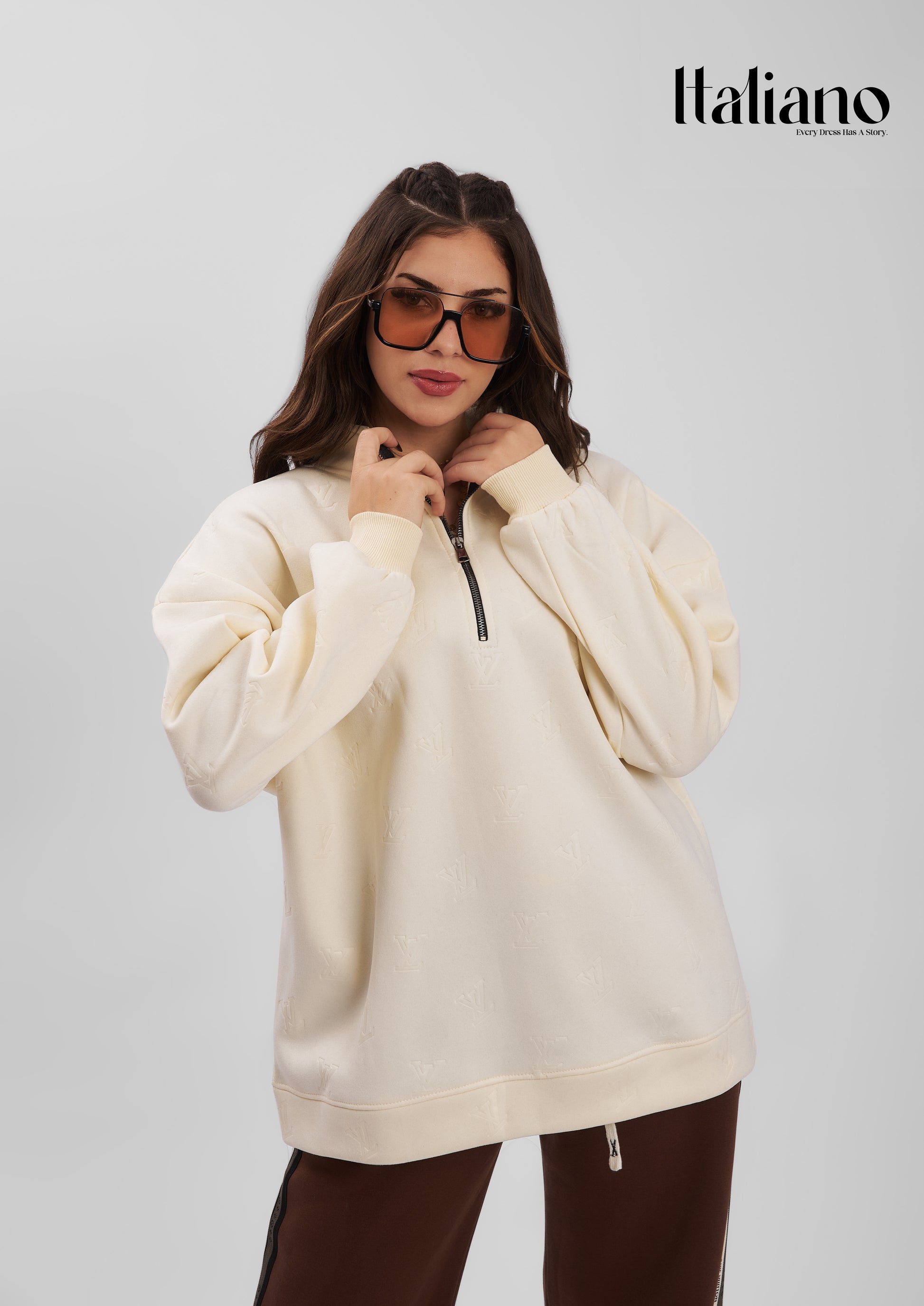 • The Top: A relaxed-fit, quarter-zip sweatshirt with a high collar and dropped shoulders for a modern, oversized silhouette.