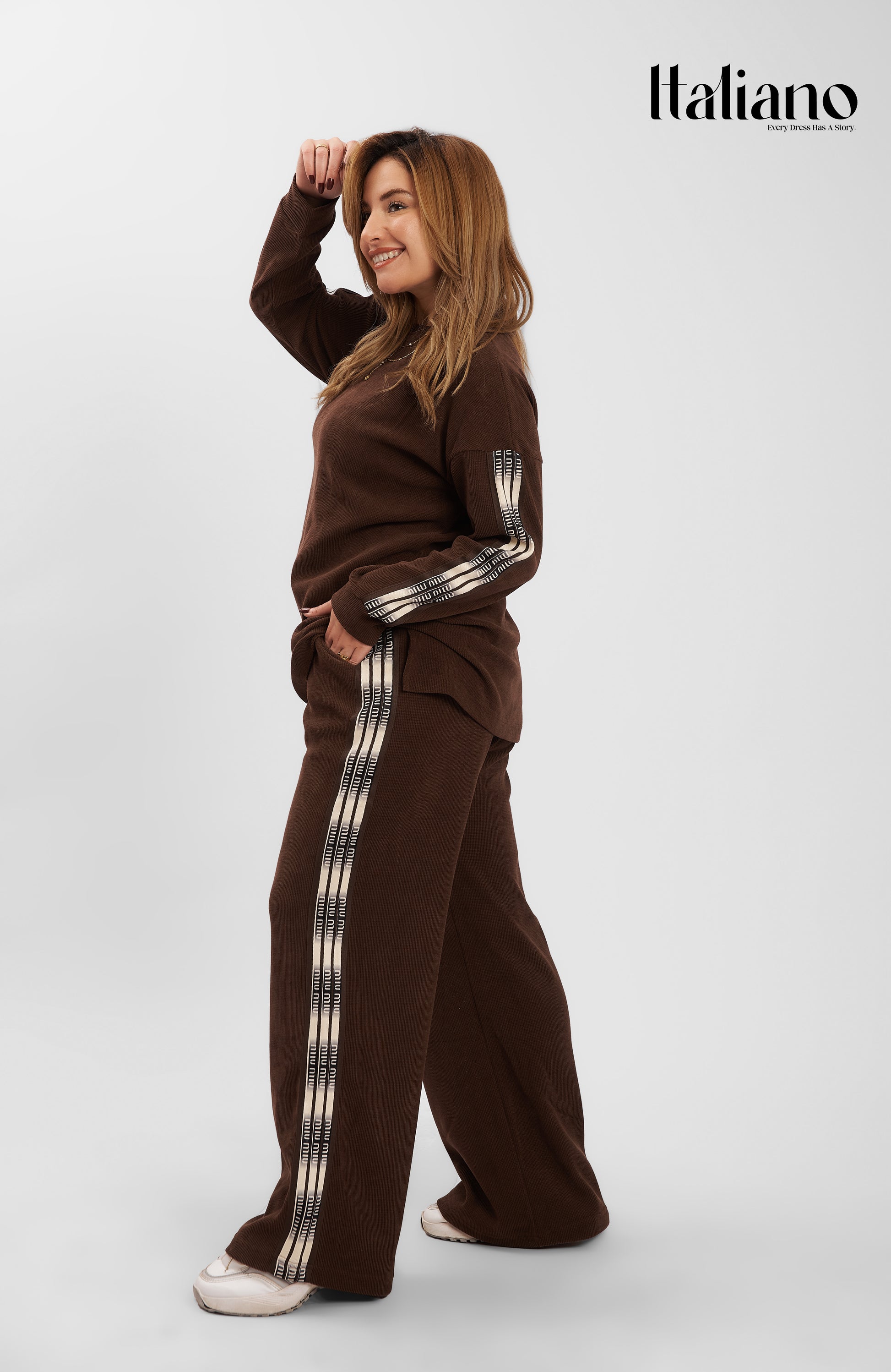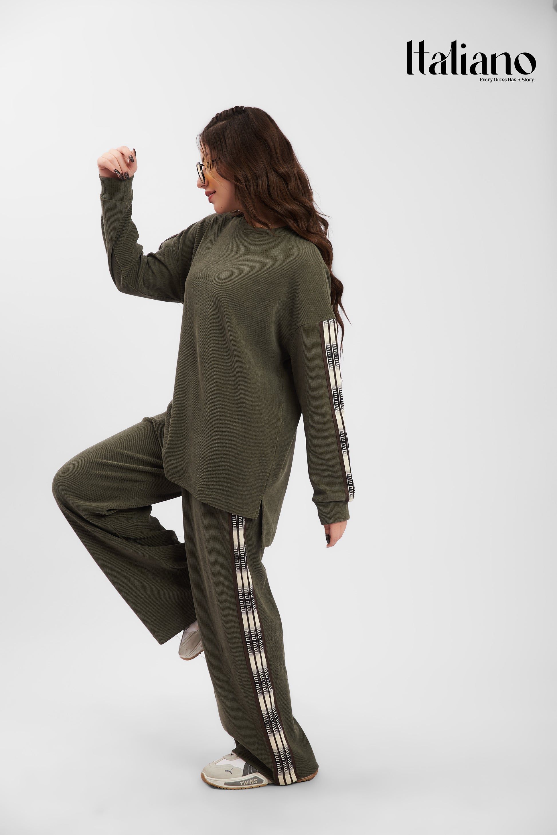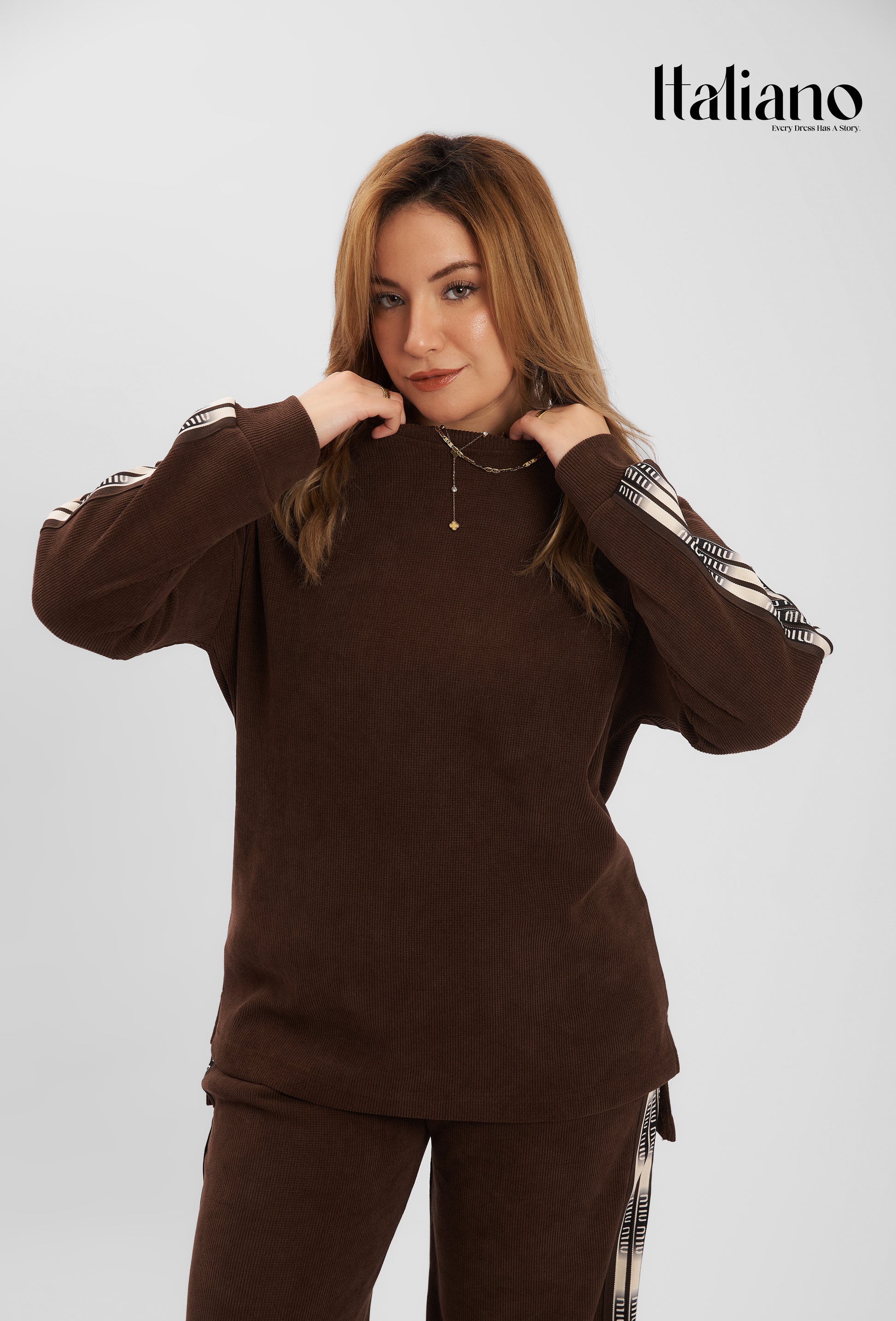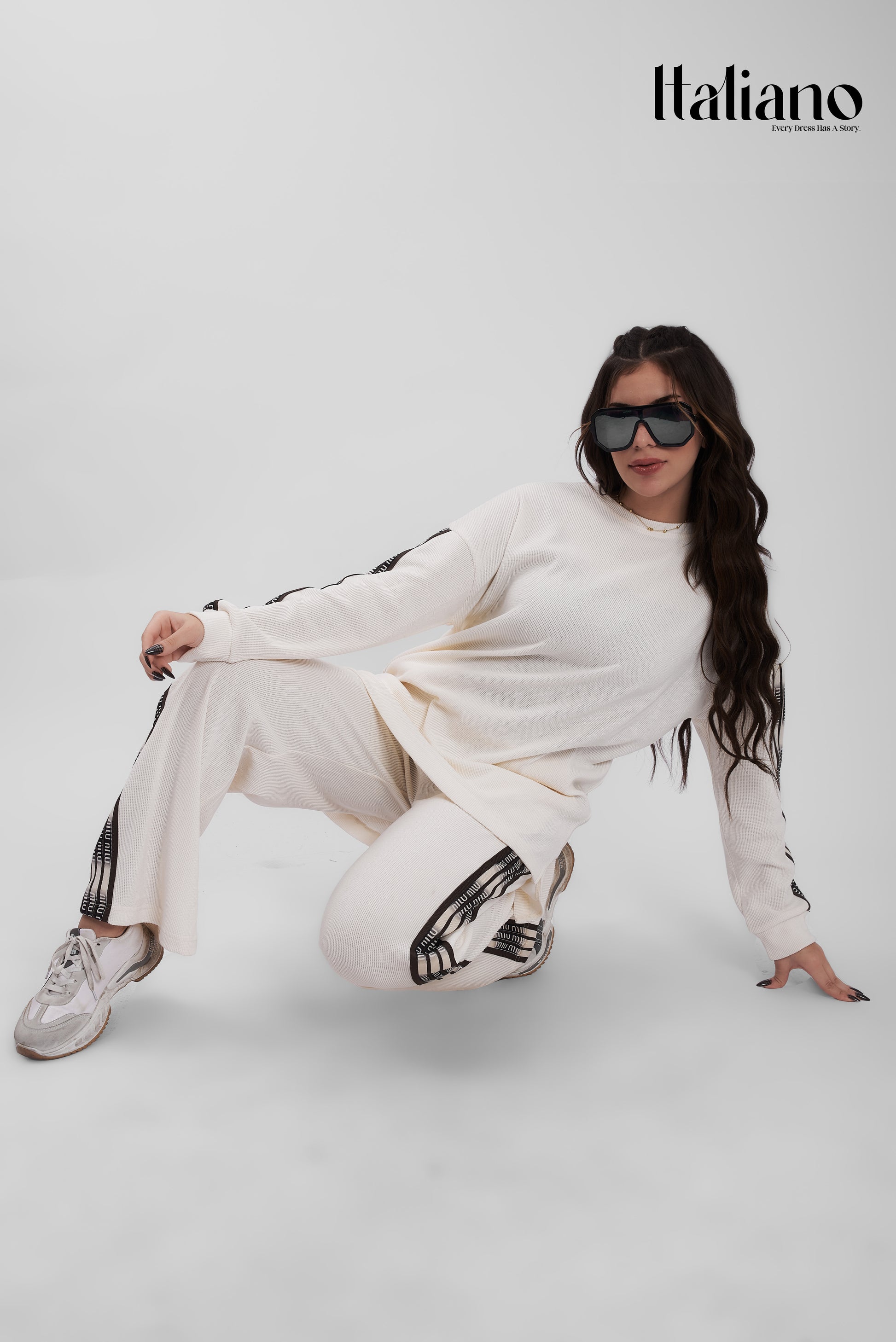 • The Top: An oversized, long-sleeve sweatshirt with a relaxed crew neck. It features iconic branded side stripes along the arms, adding a sporty yet high-end aesthetic.