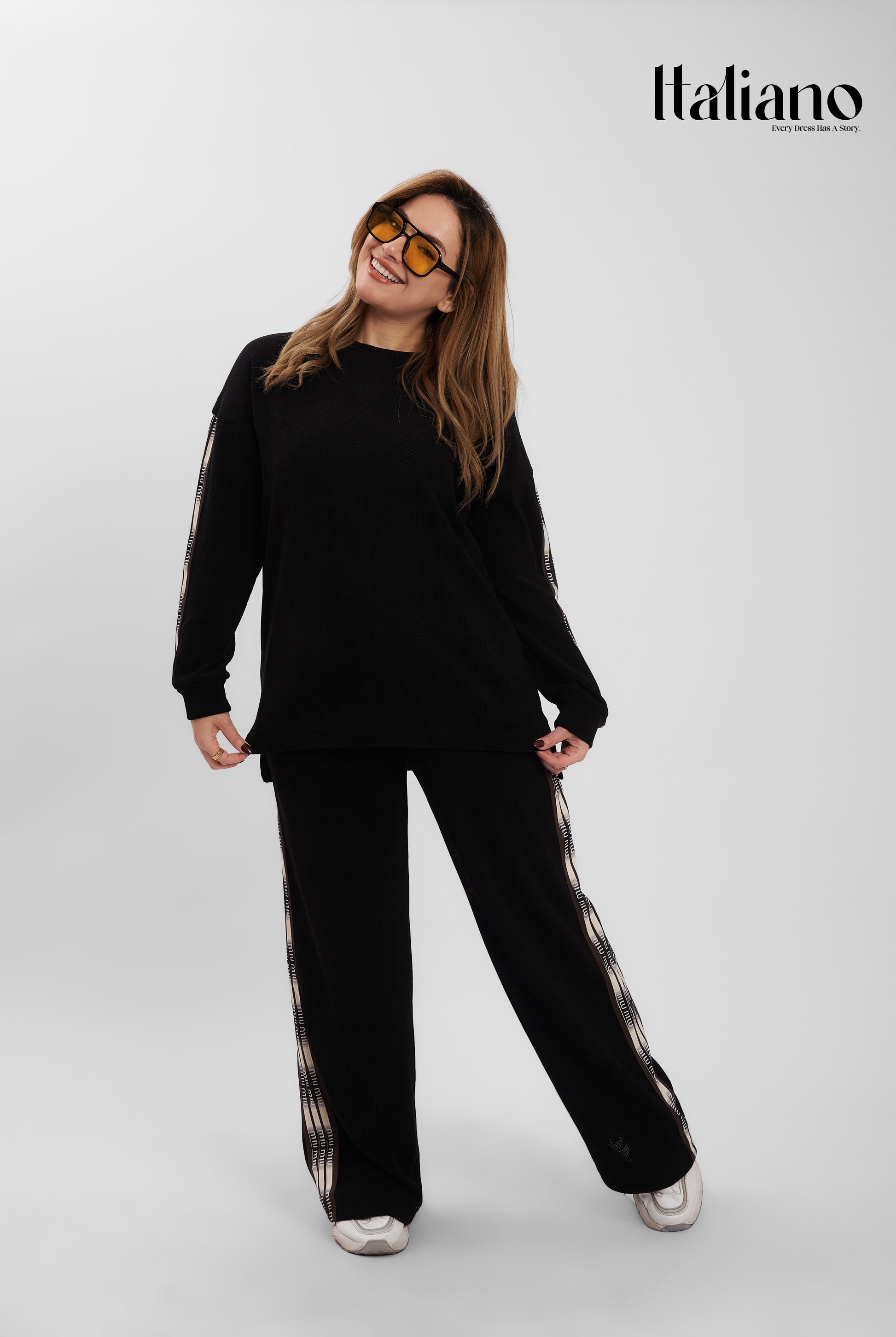 • The Pants: Matching wide-leg trousers that offer a flowy, flattering fit for all body types. The signature stripes continue down the legs for a cohesive, elongated look.